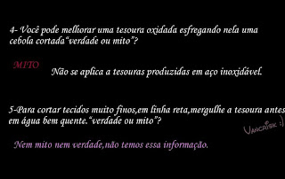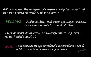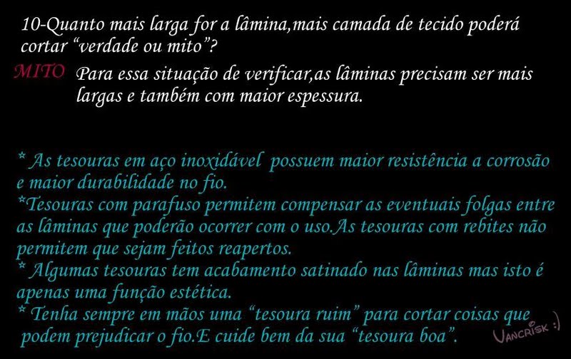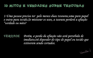 As arteiras de todas as areas precisam de tesouras. Umas mais, outras menos. Quem costura mexe com tesoura o tempo todo. O pessoal do patchwork não vive sem. Tricoteiras e crocheteiras também carregam sempre tesourinhas nem que seja só para cortar linha. Bordadeiras idem. Mas independente do trabalho que você faz, uma coisa é certa. Todas queremos obter a melhor performance das nossas tesouras - principalmente aquelas caras, que são um verdadeiro investimento. E aí surge a dúvida cruel : como devemos conservá-las para que cortem melhor e durem mais ? mitos que rodeiam a manutenção de tesouras. Todas preparadas ? Vamos lá :