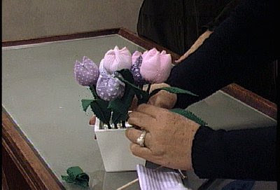 Encape uma quantidade razoável de argila com papel alumínio, e coloque dentro do vazinho. Espete as flores na argila e finalize com o musgo.