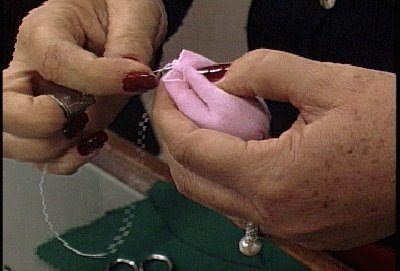 Coloque no palito já encapado e puxe o alinhavo, de forma que o tecido fique preso no palito. Use cola tecido para fixar