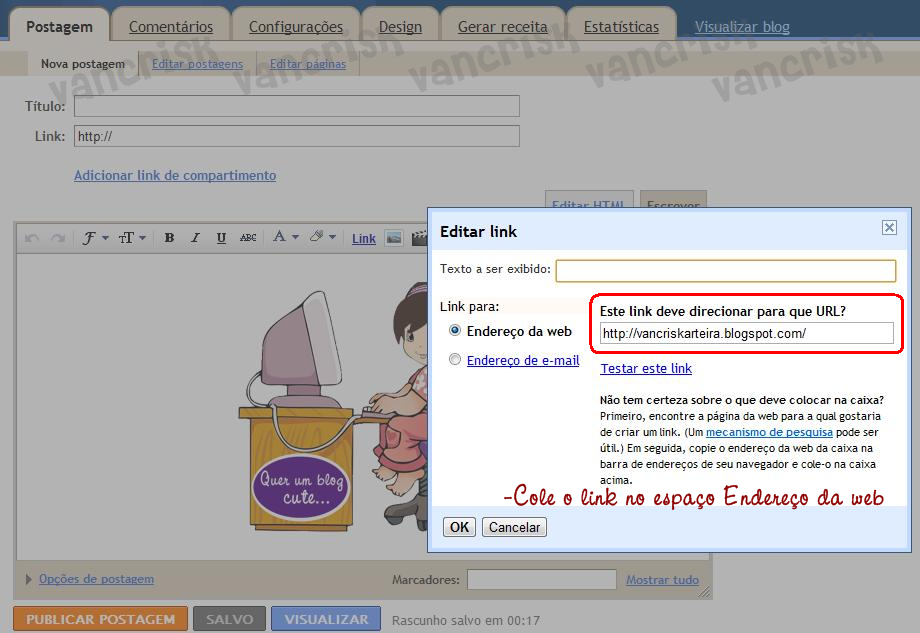 Bom dia Van, amei esse tutorial de instruções relativos a blog. Você não existe menina! Merece tudo de bom e eu te desejo uma Páscoa repleta de coelhinhos-projetos, ovos-sucesso e muuuuuuuitas alegrias junto aos seus. Grande abraço! Ilva/Matutinha
