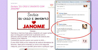 Fiquei triste:( por não ter ganhado gostaria tanto de ganhar uma máquina de costura pra aprender fazer PATCHWORK,mas tudo bem um dia eu vou ter uma e parabéns pra REGINA....