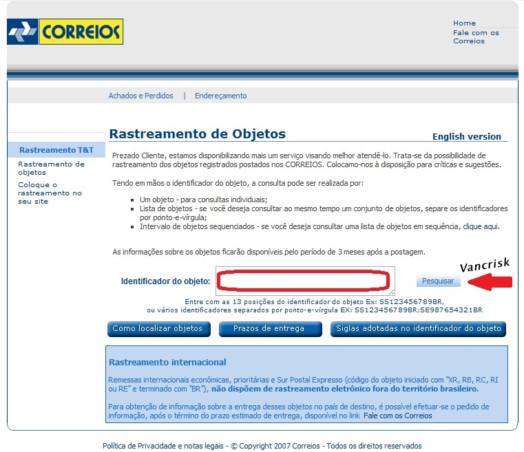 O mecanismo de pesquisa solicita esse numero (que falei a pouco) que é o código identificador do objeto,que possui 13 digitos. Coloque os dados no campo indicado e clique em pesquisar.